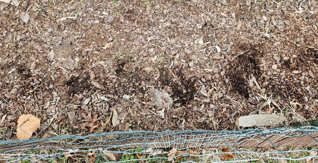 They didn’t find much and stopped after two garlic bulbs. They probably didn’t like the taste. Either way, I laid grating on top of the tiny scapes that I hope will prevent further damage.