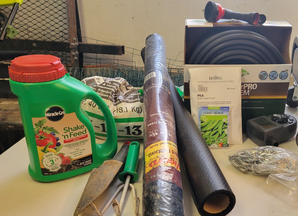 I have the space, the tiller, the fertilizer and the fencing. I have the weed barrier, the seeds, and the plant food. I have the water source and the hose. I have cover to protect the young plants and supports to help the growing ones. Now all I need is to actually start the garden.