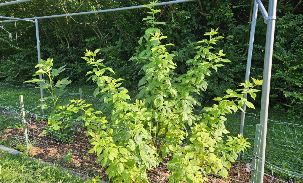 Perhaps the goal should not be excessive growth that spreads out everywhere, but a contained healthy plant that produces much fruit. My smaller tomato plants are covered in green tomatoes, while this huge raspberry produces few berries.
