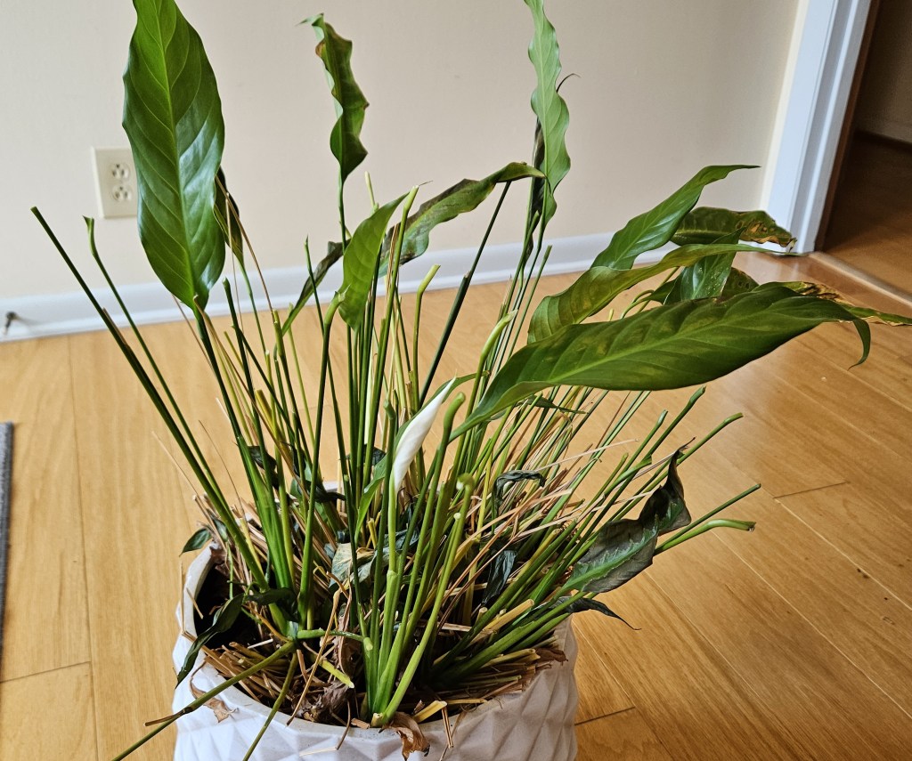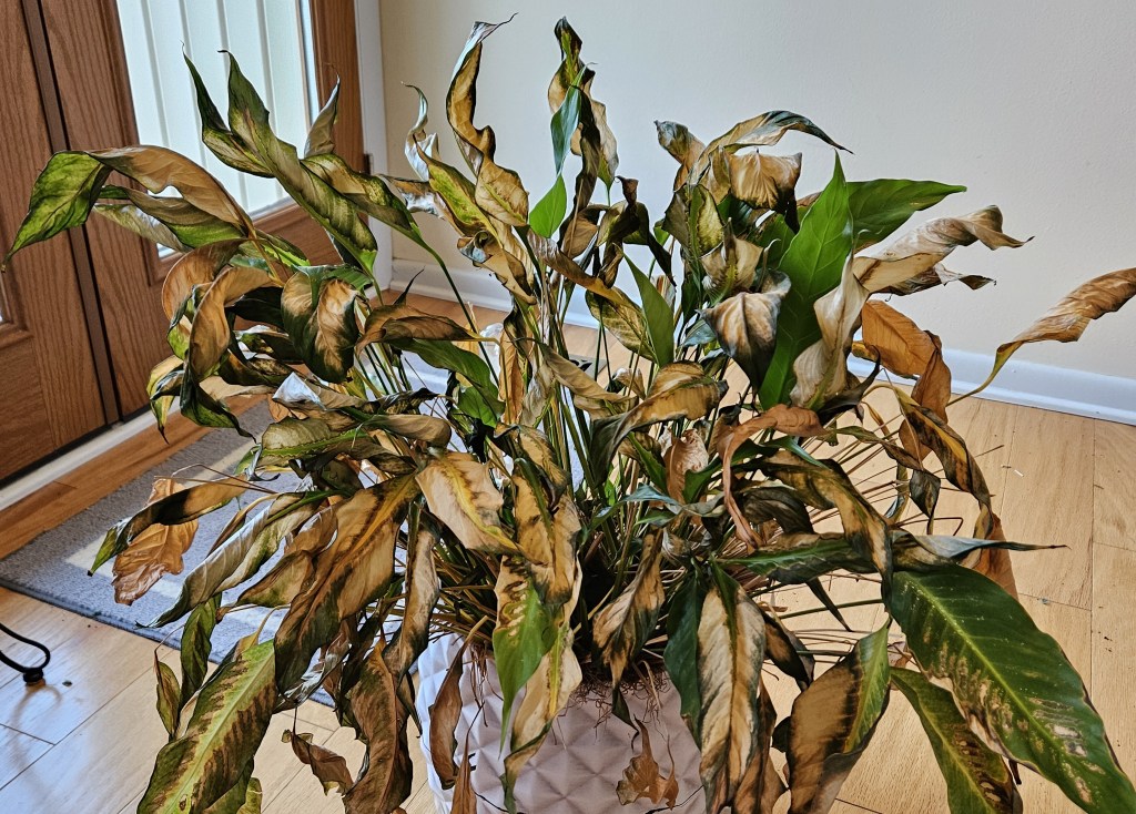 I am grateful that I did not attend this plant immediately when it was all dead and brown. I thought I would have to dispose of it. But in the weeks since power was restored, new green leaves have appeared. A white blossom has even presented itself. “I’m not dead yet!”